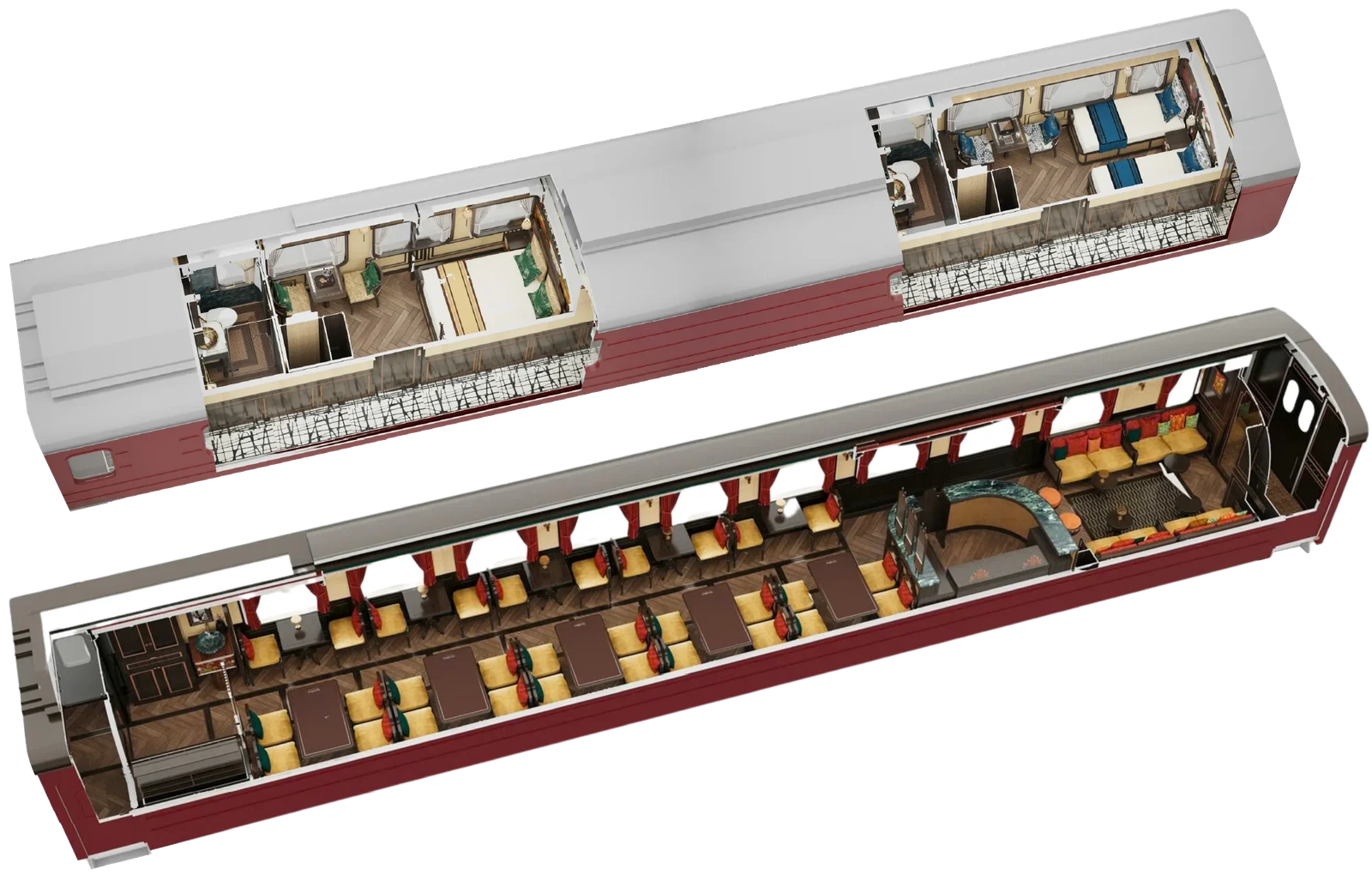 Total 08 Sleeping Cars with 05 Standard Cars for 15 Deluxe cabins, 02 Suite Cars for 4 Suite Cabins and 1 Exclusive Imperial Suite Car. The 05 Service Cars features 01 Kitchen Car, 01 Restaurant Car, 01 Premium Restaurant Car exclusive for Suite and Imperial Suite, 01 Lounge Car and 01 Staff Car